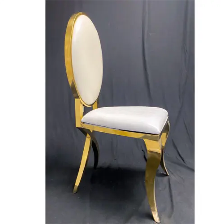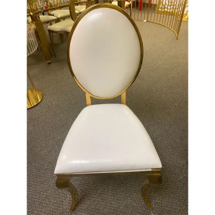 Our Throne Cross-Back and Curved Front Leg Chair in stainless steel gold—a perfect choice for weddings or parties. With its regal design and durable construction, it adds elegance and comfort to any event. Make a statement with these exquisite chairs and elevate your celebration effortlessly.