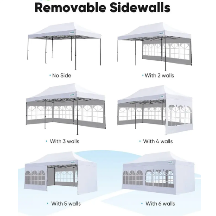 The Canopy tent 10x20 comes with four(4) cathedral window sidewalls and two(2) solid zipper sidewalls. Each sidewall is removable and interchangeable to meet all your requirements.